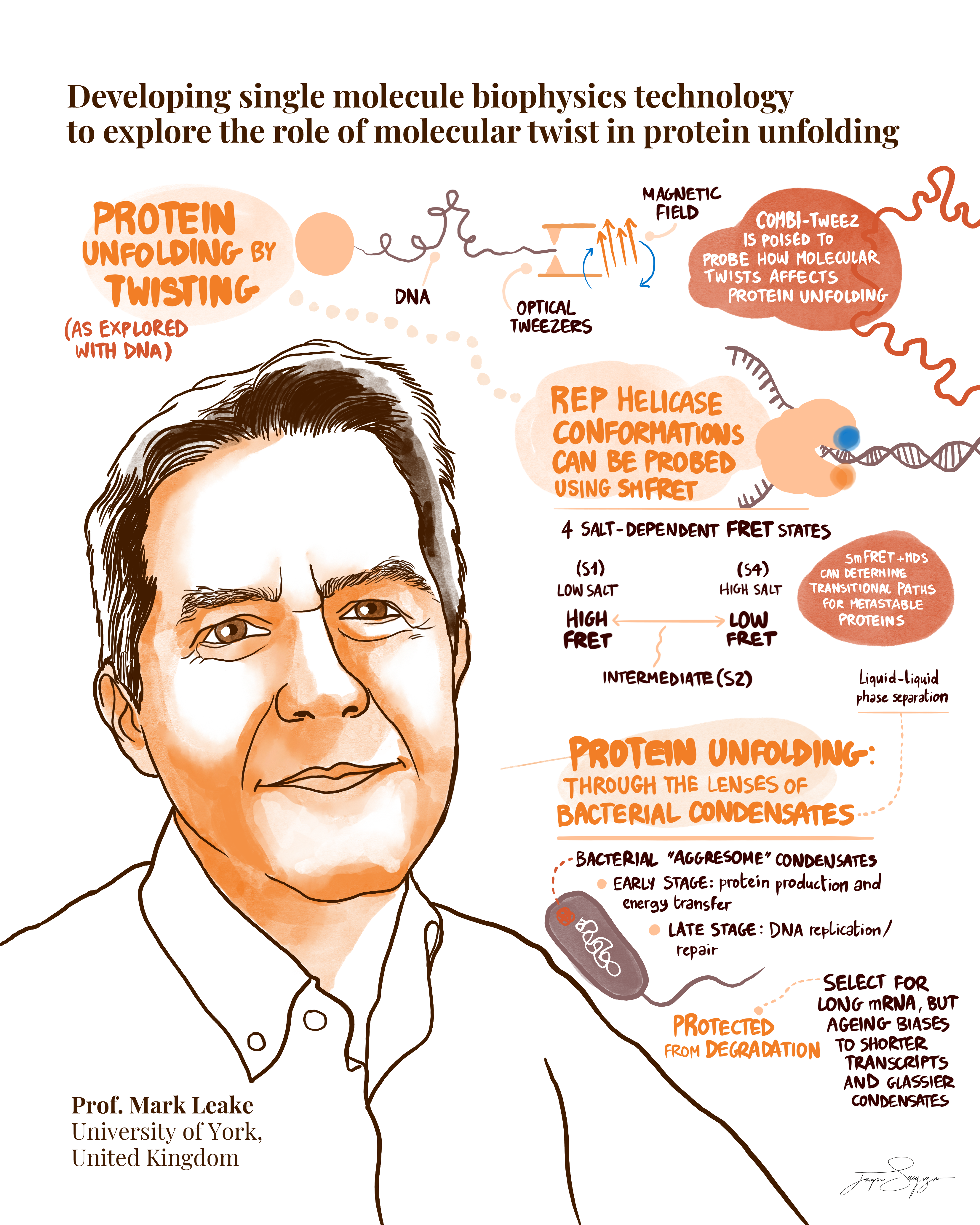 Mark Leake is a physicist by training, addressing challenging biophysical and biochemical questions in a range of biological processes. Following initial ‘natsci’ studies in the University of Cambridge, he gained his biophysics PhD on muscle proteins using optical tweezers in King’s College London, later postdoctoral positions in Oxford and Heidelberg. He gained independence as a Royal Society URF in Oxford, leading research in single-molecule biophysics, prior to becoming Anniversary Chair of Biological Physics at the University of York and Director-Founder of the Biological Physical Sciences Institute in 2013 and Coordinator of the Physics of Life Group in 2019, a biophysics collective of ~10 research teams. His research involves (i) developing new biophysical instrumentation for addressing open biological questions; (ii) coupling these to molecular biology/biochemistry to investigate single biomolecules under physiologically relevant environments. He has developed a cluster of biophysical techniques enabling imaging and manipulation of single molecules with extraordinary control. This scientific success is founded on single-molecule fluorescence microscopy with molecular and cellular manipulation and precision microfluidics technology. He is in an ideal position to step from single molecules to investigating complex processes at higher length scales of cells and tissues. His work has added insight into the behaviour of the flagellar motor of bacteria, DNA replication, repair and remodelling, protein transport, oxidative phosphorylation, and signal transduction and gene regulation, underpinned by innovative tools enabling robust quantification of molecular and cellular properties: spatiotemporal dynamics of functional molecular machines, their architectures, mechanics and functional interactions